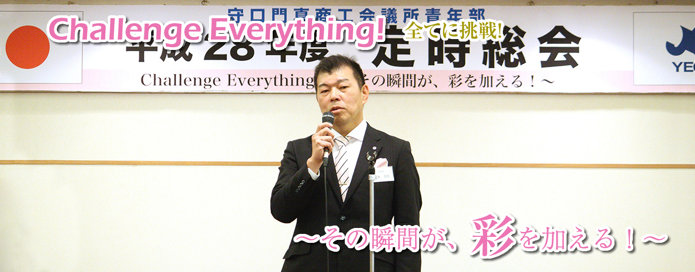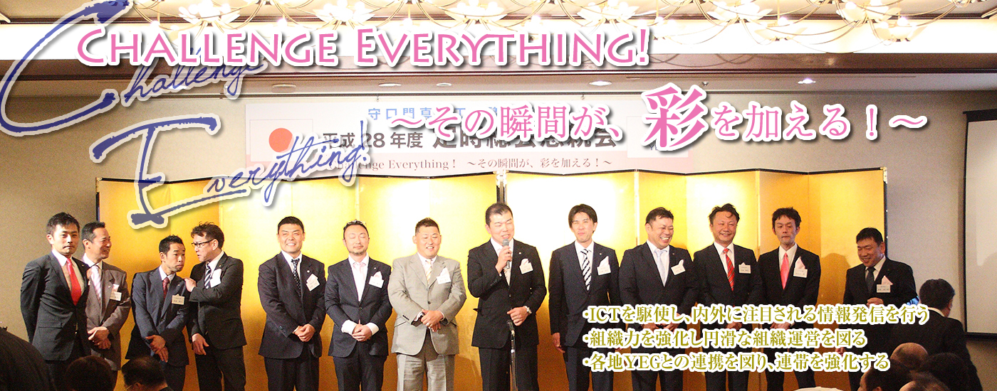 守口門真YEGが創立してから本年度で32年目を迎えます。32年前に先輩方は大きな理念を掲げて、青年部を立ち上げられ、今日まで多くの事業を行い、自己の研鑽、自社の発展により、守口市、門真市の地域の活性化に寄与してこられ、現在の礎を築いて頂きました。我々はこの素晴らしい伝統を引き継ぎながら、時代にマッチしたリノベーションを行い、新たな風を吹き込み、新たな環境を創ってまいります!