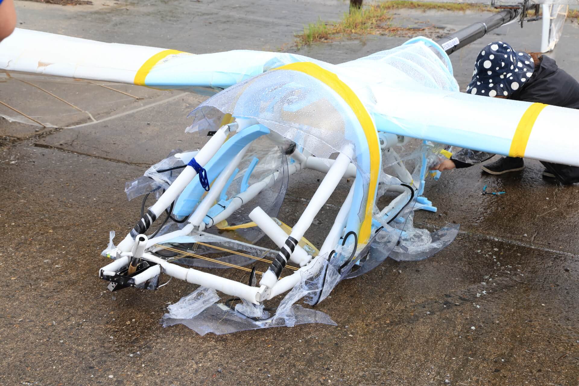 令和元年7月28日本番当日。守口市、門真市の未来を乗せて、1mでも前へと意気込んでフライトに臨みましたが、あいにくの天候となり、フライト結果11.4mという結果になりました。しかし、当機体はしっかりと風を掴むことができ、前へ進むことができました。